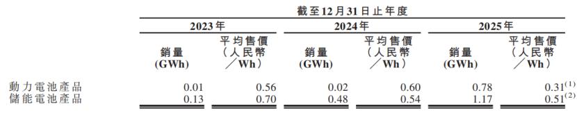 从2025年起,公司开始向头部汽车厂商大批量供应动力电池产品,平均售价从2024年的0.60元/Wh降至2025年的0.31元/Wh。
