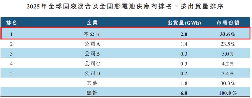 2025年全球固液混合及全固态电池供应商排名,来源:招股书
