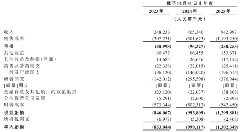 2023年、2024年及2025年(报告期),公司的营业收入分别为2.48亿元、4.05亿元、9.43亿元,毛损率分别为23.8%、23.8%及26.5%,净利润分别为-8.53亿元、-9.99亿元、-13.02亿元。
