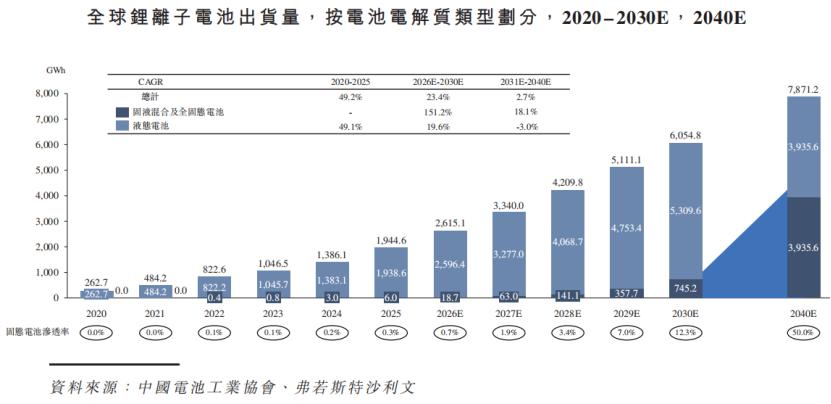 随着商业化进程推进,固液混合及全固态电池出货量预计将快速增长,到2030年达到745.2GWh,市场渗透率预计提升至约12.3%。