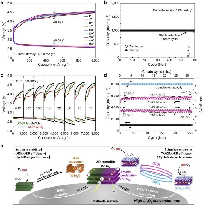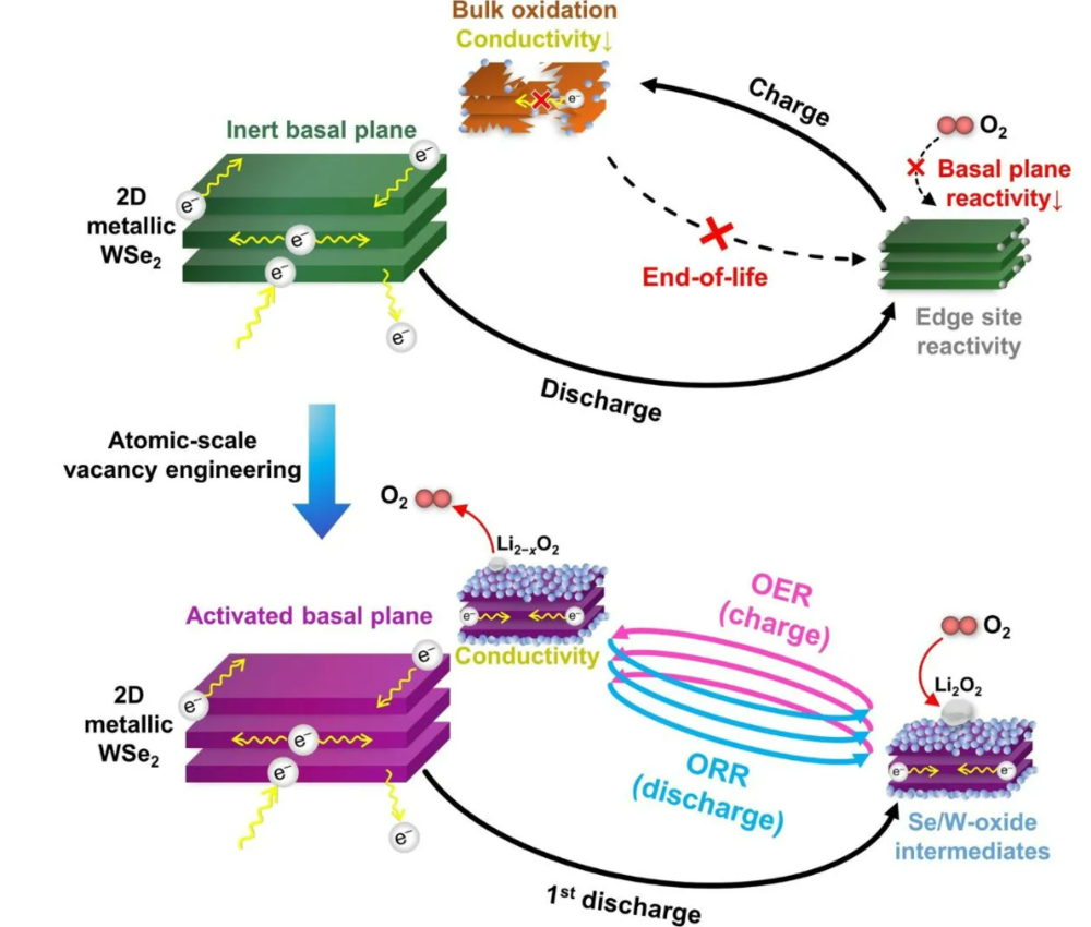 这项创新将材料通常不活跃的表面转化为完全活跃的催化层,显著提升了锂空气电池的性能与耐久性。具体是通过将铂原子引入二维纳米材料(WSe₂)的层状结构,并在硒原子缺失处人为制造原子级空位实现的。