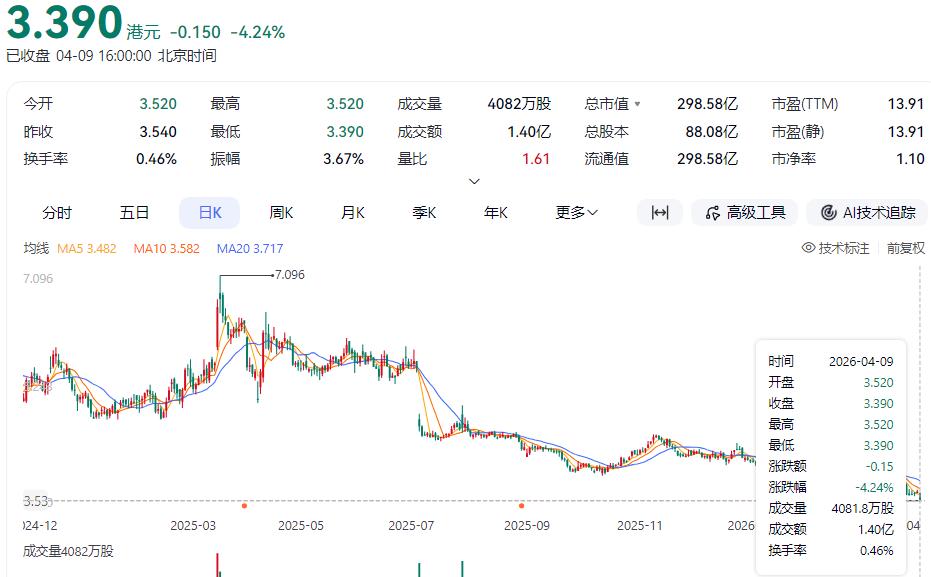 截至4月9日收盘,中国飞鹤港股股价报3.39港元/股,创2025年以来新低,较2021年约24.06港元/股的高位,累计跌幅达86%,总市值更是跌破300亿港元,仅约298.6亿港元。