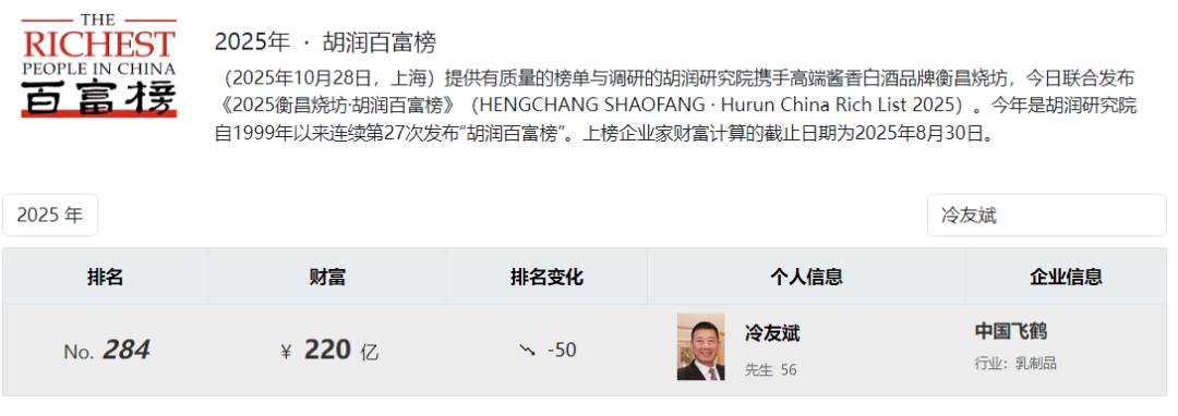 东方财富网显示,中国飞鹤董事长冷友斌持有公司49.38%的权益股份,据此计算,他可获得公司大部分分红。《2025年·胡润百富榜》显示,冷友斌个人财富220亿元,位列榜单第284位。