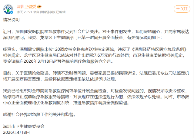 事件发生后,龙华区卫生健康局调查认定,深圳健安医院违反《深圳经济特区医疗急救条例》,存在“不按照调度指令运送患者”的违法行为,且“性质恶劣,情节严重,破坏公共救援体系根基”。