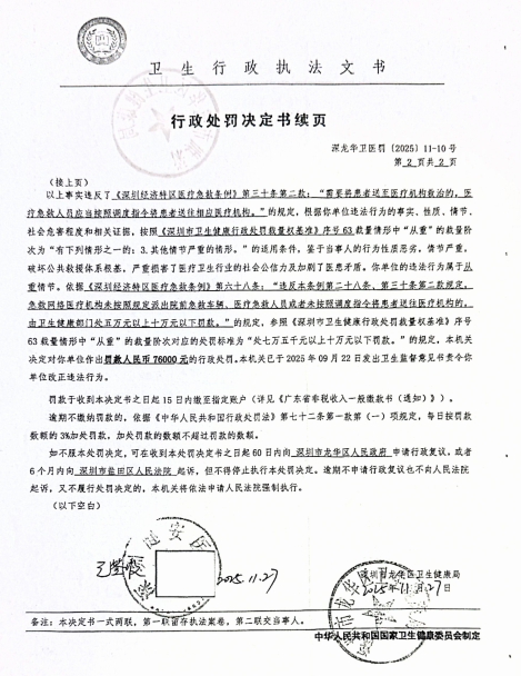 依据该条例第七十五条,急救网络医疗机构不按调度指令运送患者的,“由市卫生健康部门责令改正,处五万元以上十万元以下罚款”。2025年11月,龙华区卫健局对健安医院作出罚款7.6万元的行政处罚,并暂停其院前急救资质半年。7.6万元接近该条款“从重处罚”档次(7.5万-10万元)的下限。