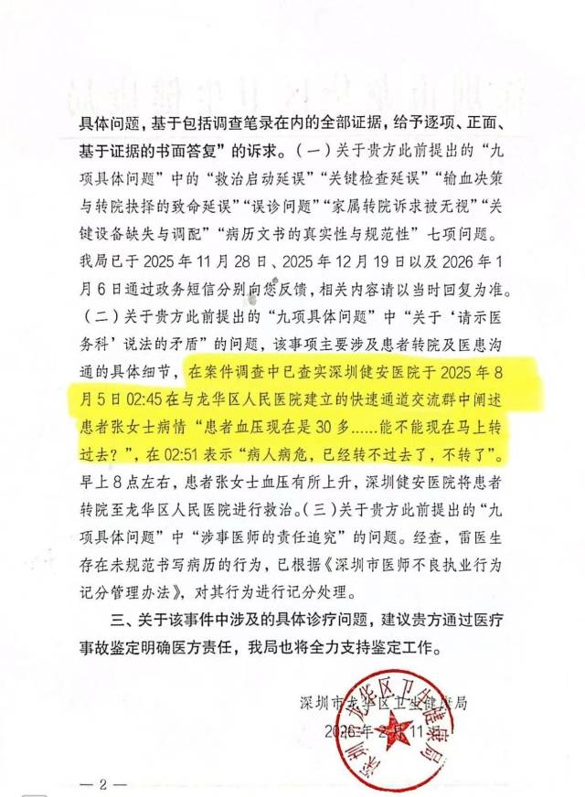龙华区卫健局给家属的《答复意见书》呈现了当时情景: