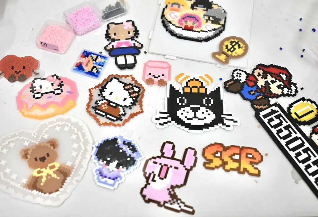 它的玩法是把彩色塑料豆排列组合成各种图案,再通过加热让豆粒固定成型,简单来说就是先拼图案再用工具烫压。