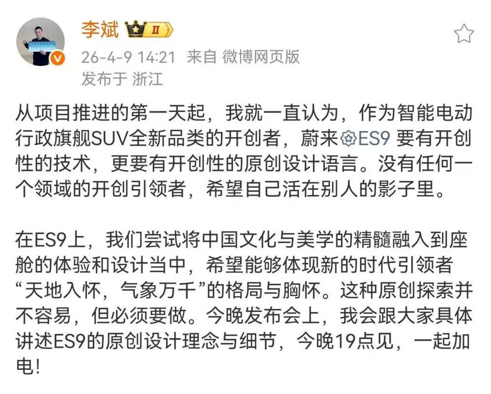 正因如此,汽车设计原创性的话题持续被探讨。4月9日,蔚来ES9发布前夕,李斌在社交平台发文称“没有一个领域的开创者,希望活在别人的影子里。”