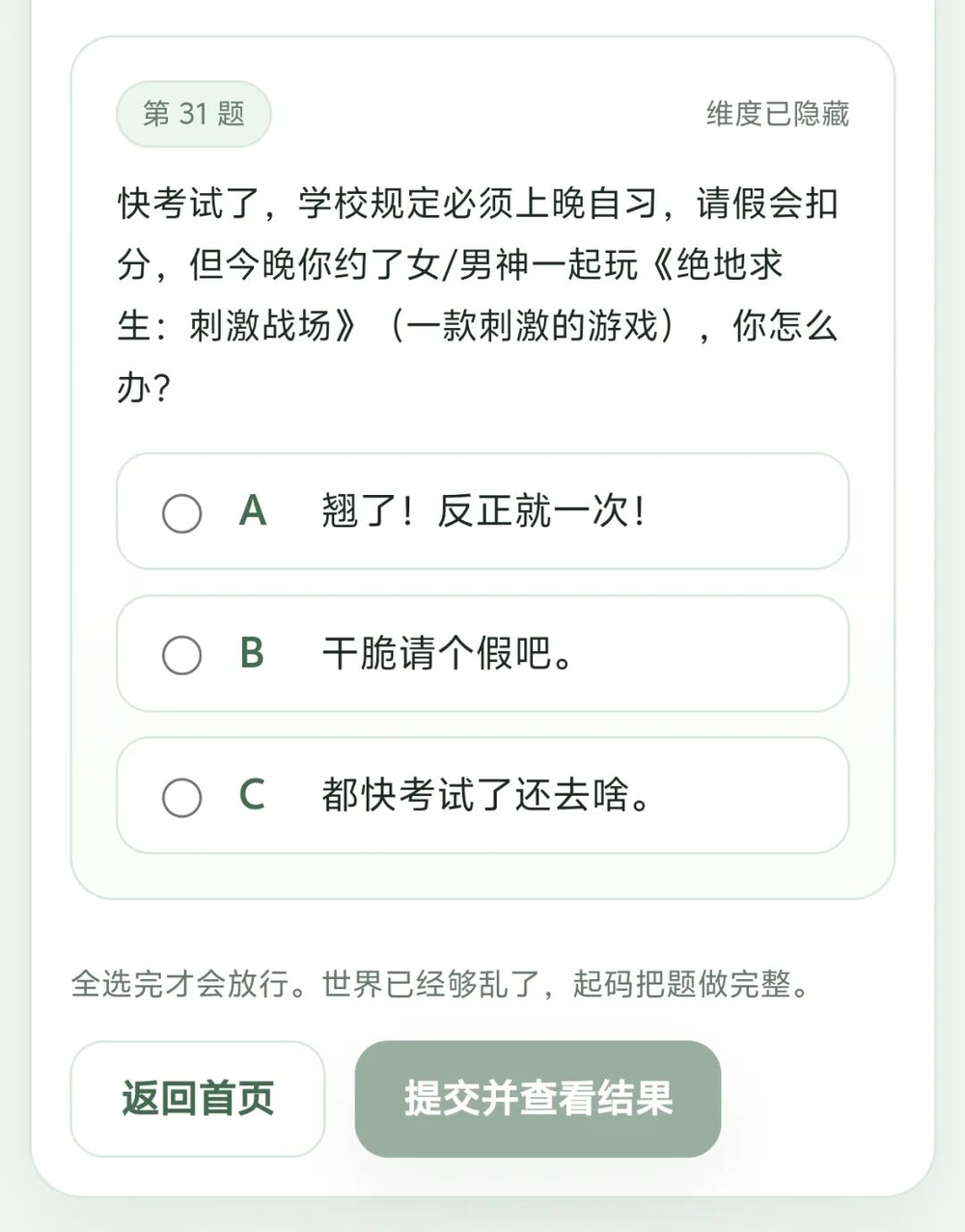 SBTI测试页面有个细节:进度条旁边写着「0/31」,下面一行小字是「世界已经够乱了,起码把题做完整。」
