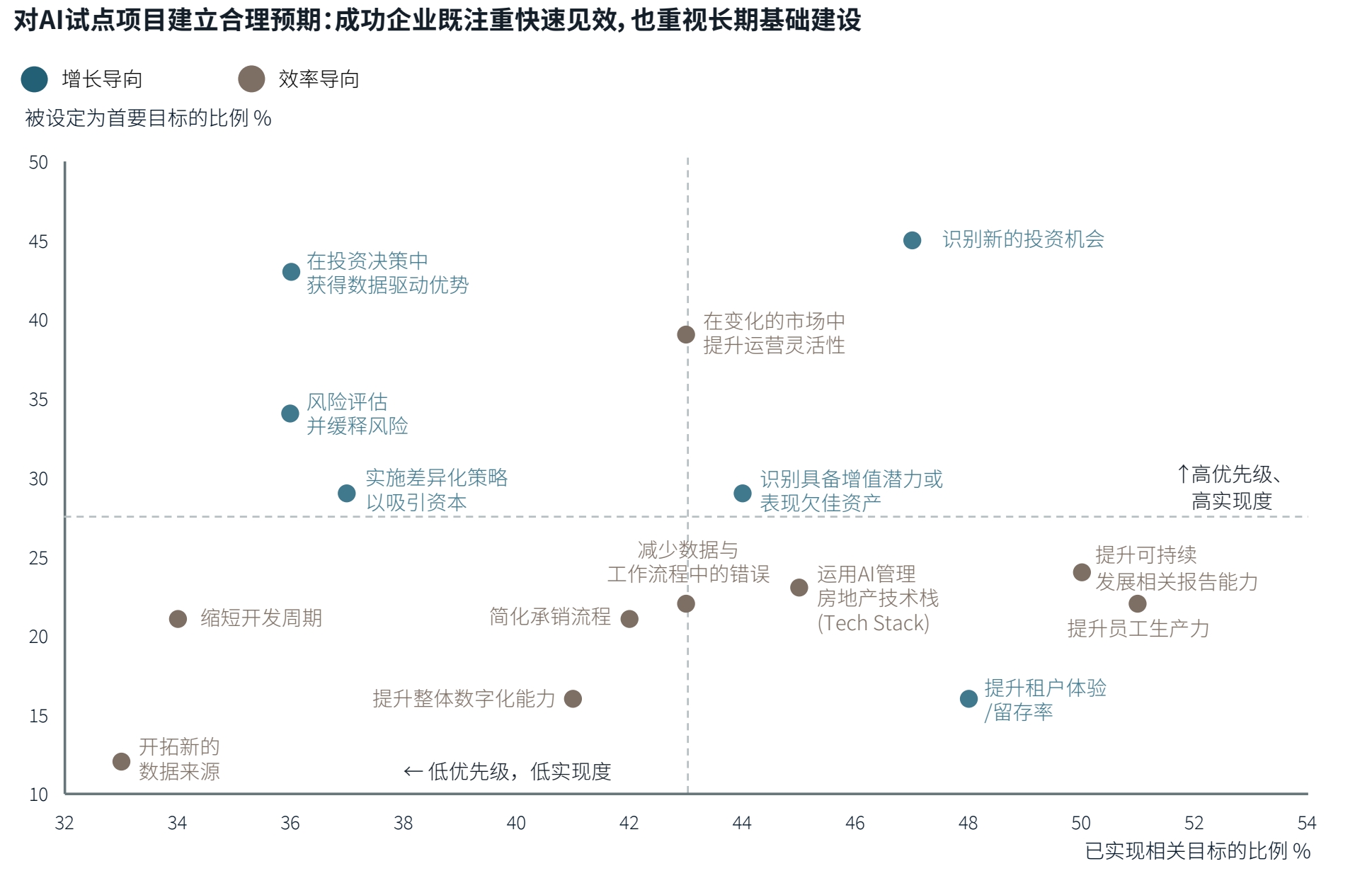 报告指出,企业在部署AI时正瞄准更高阶的价值目标:战略重心正在从提升运营效率转向驱动业务增长,房地产投资者们普遍期待AI能从后台走向前台,从成本中心走向利润中心,为行业注入新的增长动能。