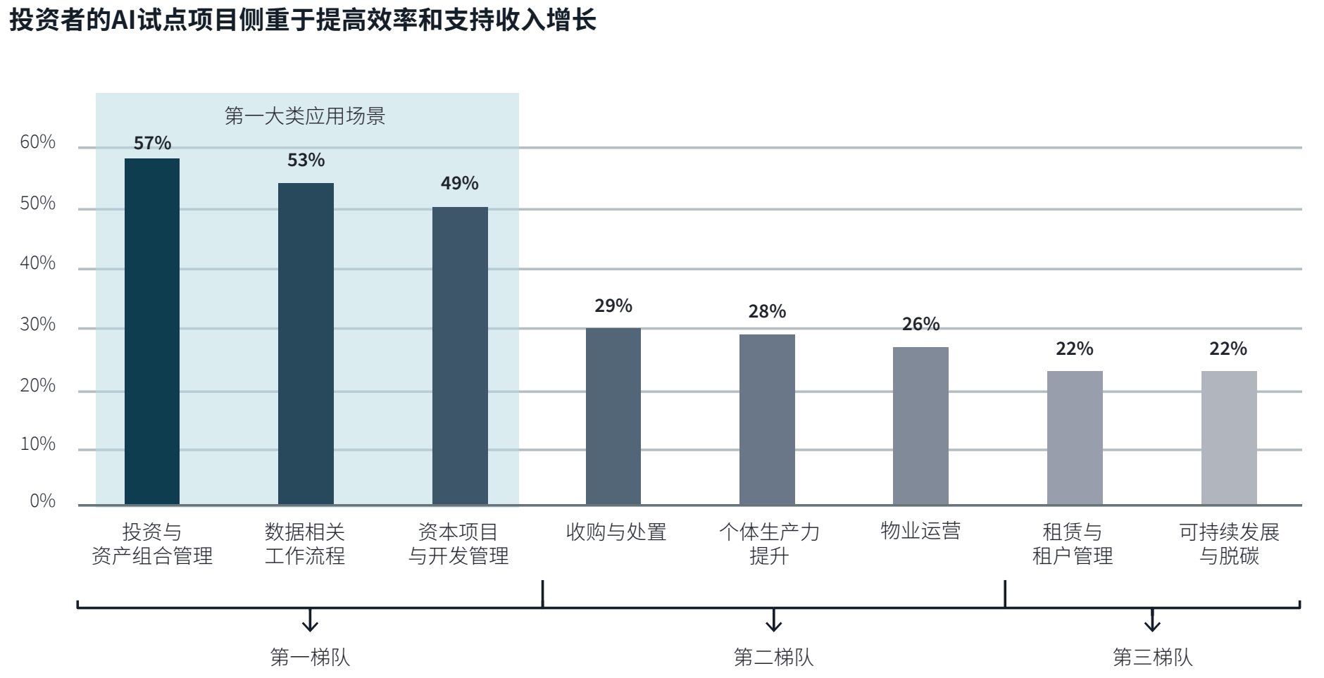 具体来看,多数受访企业平均同时推进约五个AI试点项目,并将AI优先配置在最贴近核心业务的价值环节,首要应用场景包括投资与资产组合管理、数据相关工作流程、资本项目与开发管理等。