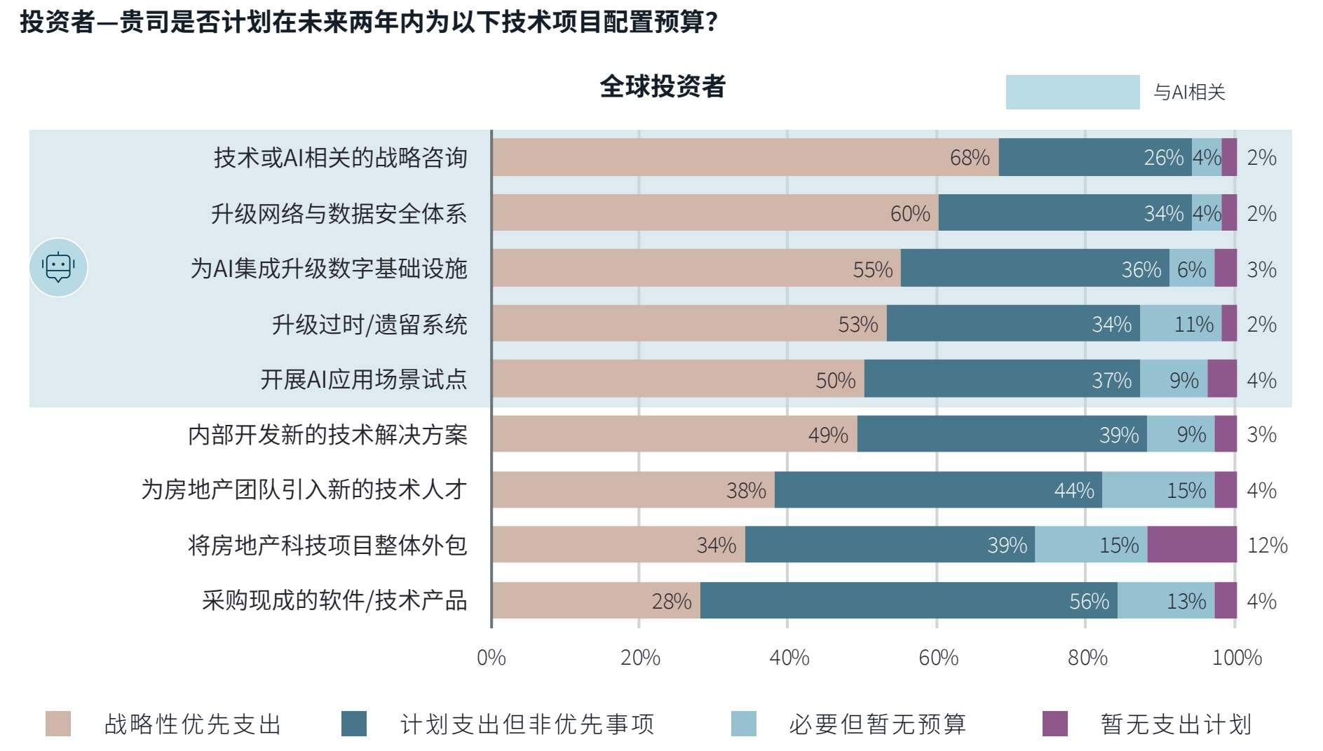 从行业发展脉络来看,房地产投资者的AI布局正经历从“效率工具”到“增长引擎”的战略转变。长期以来,商业地产行业因产业链长、决策周期久,在技术应用方面相对谨慎,但此次调研数据打破了这一固有认知——88%的投资者与业主正在开展AI试点项目,较2023年的5%实现质的飞跃。87%的受访投资者正在增加房地产科技预算,其中排名前五的预算支出均与AI直接相关。