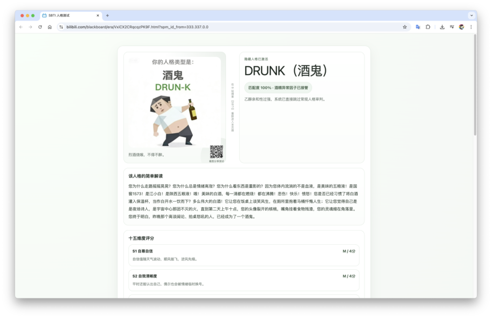 据UP主介绍,SBTI最初是为了劝朋友戒酒设计的,题目没有明确的心理学依据,只要在与喝酒相关的引导性问题上选择正向答案,测出来的人格就一定是「酒鬼」。