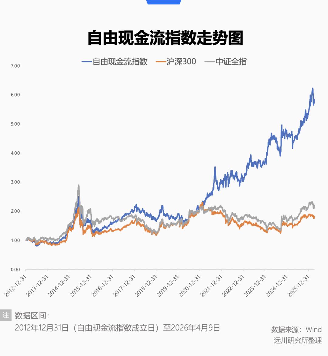 当年2月沪指创下小牛市新高后,进入长周期震荡,而自由现金流指数开始与大盘脱节,一路上行。2021全年,沪指上涨4.8%,沪深300下跌5.2%,自由现金流指数则上涨43.81%。