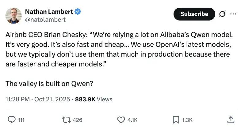 Shopify切换至Qwen后,每年节省500万美元;爱彼迎联合创始人Brian Chesky也表示:Qwen好用、快速又便宜,比GPT还实用!