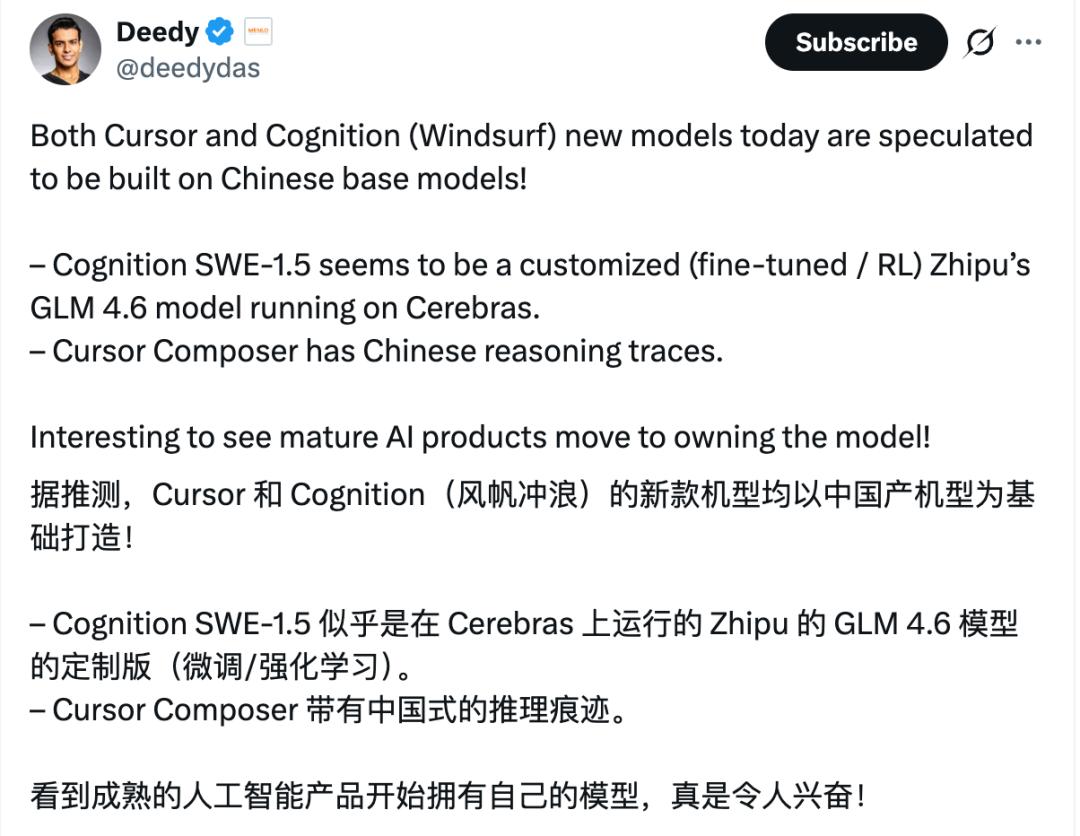 首个推出“AI自动工程师”Devin的Cognition公司,其自研模型SWE-1.6疑似基于GLM模型进行后训练。