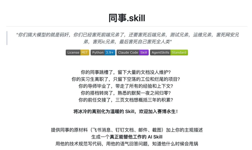 3月30日在GitHub上线开源的“colleague-skill(同事.skill)”意外地走红,随后“前任.skill”“老板.skill”“女娲.skill”“马斯克.skill”等相关项目纷纷涌现,掀起了“蒸馏.skill”甚至“反蒸馏.skill”的风潮。这个项目在小长假期间收获了7.5k+的标星(截稿时已达11.8k标星,1k复刻,感兴趣的读者可以去看看复刻者们的留言),其贡献者titanwings也因此在中文互联网上一战成名。