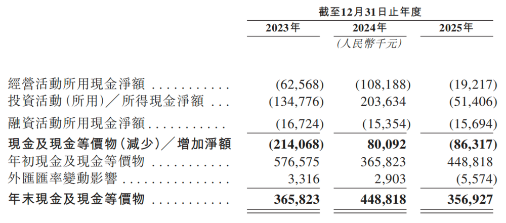 与此同时,公司主营业务尚未形成稳定的现金造血能力。2023年至2025年,经营活动产生的现金流量净额连续为负,分别为-0.63亿元、-1.08亿元和-0.19亿元。对应地,公司账面现金储备呈现波动:2023年末约为3.66亿元,2024年末上升至4.49亿元,但2025年末又回落至3.57亿元。
