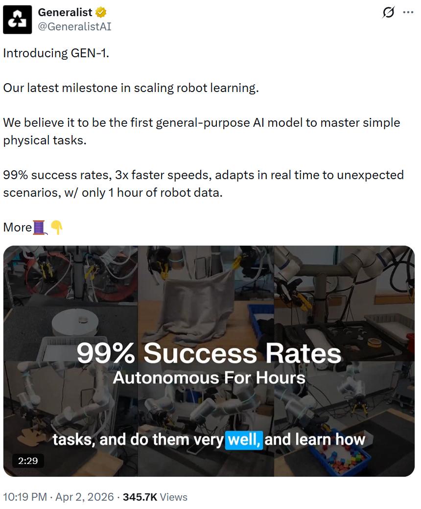 据官方介绍,GEN-1在多任务中成功率达99%,执行速度提升3倍,还具备强大的意外恢复能力。这些亮眼数据背后,是具身基础模型首次触及关键门槛——从「能演示」阶段稳步迈向「可部署」的商业化阶段。