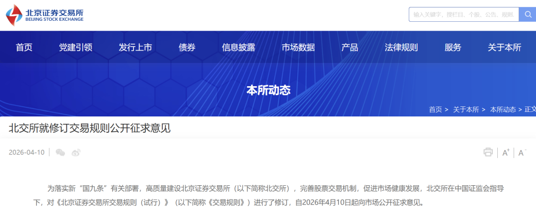 【导读】上交所、深交所、北交所于4月10日分别发布交易规则修订征求意见稿,围绕交易机制完善、监管措施优化等方面推出多项调整
