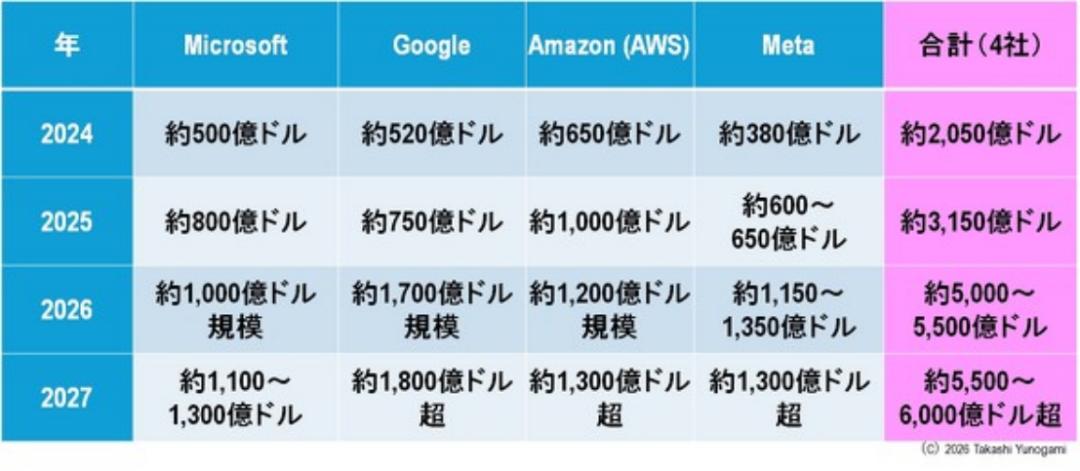 现阶段,人工智能行业增长前景已受根本性动摇。仅上述四家企业市值总和超8万亿美元(约合1200万亿日元),若人工智能服务器供应长期停滞,市场对行业增长的预期将大幅下降,面临1万亿至2万亿美元(约合150万亿至300万亿日元)的市值损失风险。