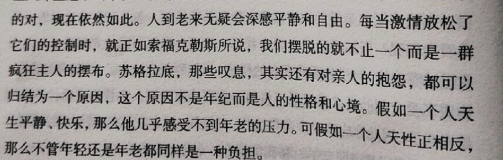 柏拉图《理想国》中,老旅客克洛法斯回应苏格拉底“晚境是否痛苦”的问题,说“随着肉体享受需求减退,我爱上机智清谈,且越来越喜爱”。他还引用索福克勒斯的话,表达清心寡欲、中庸平和的好处:“像摆脱了许多凶恶奴隶主的羁绊。”