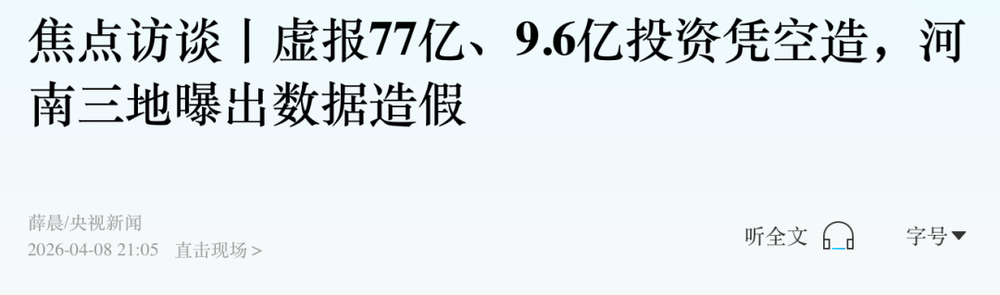 日前,央视《焦点访谈》在河南调查发现,多地统计引进省外资金时存在虚构项目、编造数据的情况:漯河市舞阳县上报省外到位资金78亿元,当地承认实际到位仅1亿多元;郑州市管城区虚构投资9.6亿元;商丘市柘城县虚报省外到位资金40余亿元。