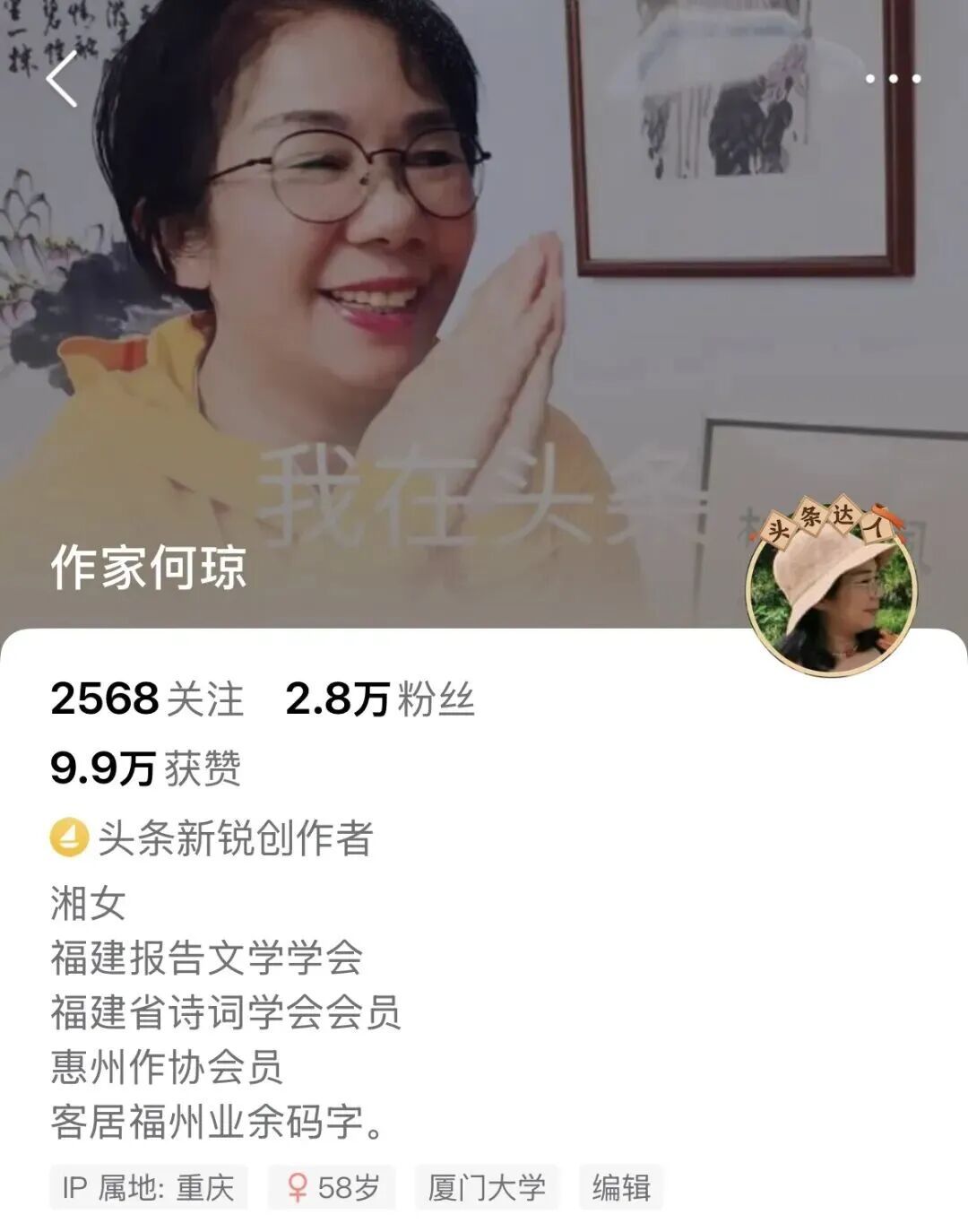 她通过成人高考获得厦门大学中文系学位,现在是一名作家,曾在多个文学单位任职。八妹还搜到了她的社交媒体: