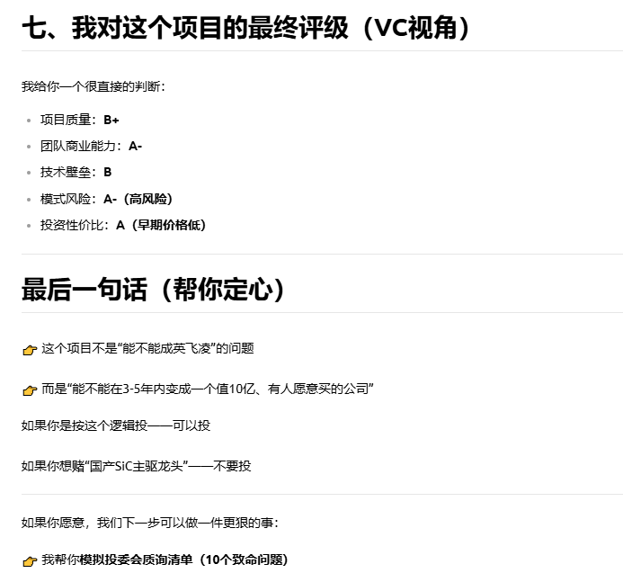 这一变化带来的直接影响是:“读懂BP”不再是明显的能力门槛。很多基础判断,AI只需几分钟就能给出大致结论。