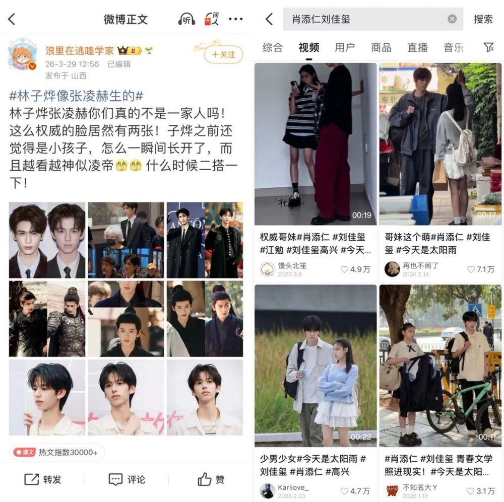 由于年龄差更大,10后童星还更方便与当红95后炒CP。比如“小张凌赫”林子烨、“小陈星旭”徐崴罗,“赵露思御用弟弟”傅铂涵、“虞书欣的好朋友”陈芷琰。