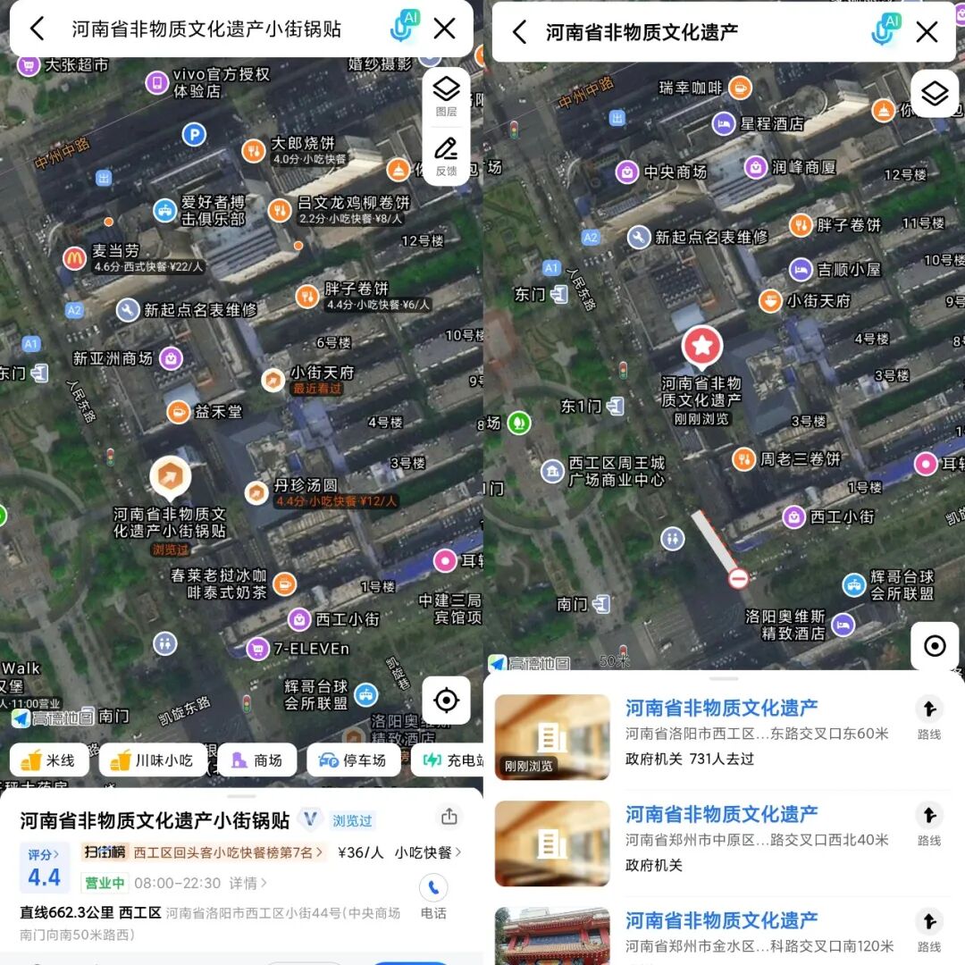 比如,洛阳一家名叫小街锅贴的饭店,在高德地图上的店名前方加上了“河南省非物质文化遗产”字样。