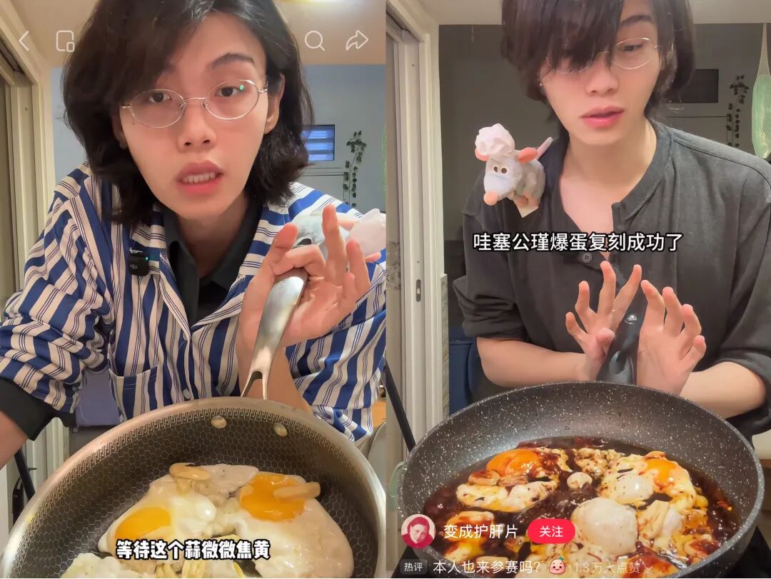 网红美食“公瑾爆蛋”为他走红添了把火。这道菜去年12月就出现在他餐桌,粉丝多次求问菜名,当时叫“糖醋蛋”。粉丝求教程后,他用仅剩生活费买无菌蛋,魔性发音称其“公瑾爆dan~”,糖醋荷包蛋就此成网友争相复刻的网红美食。