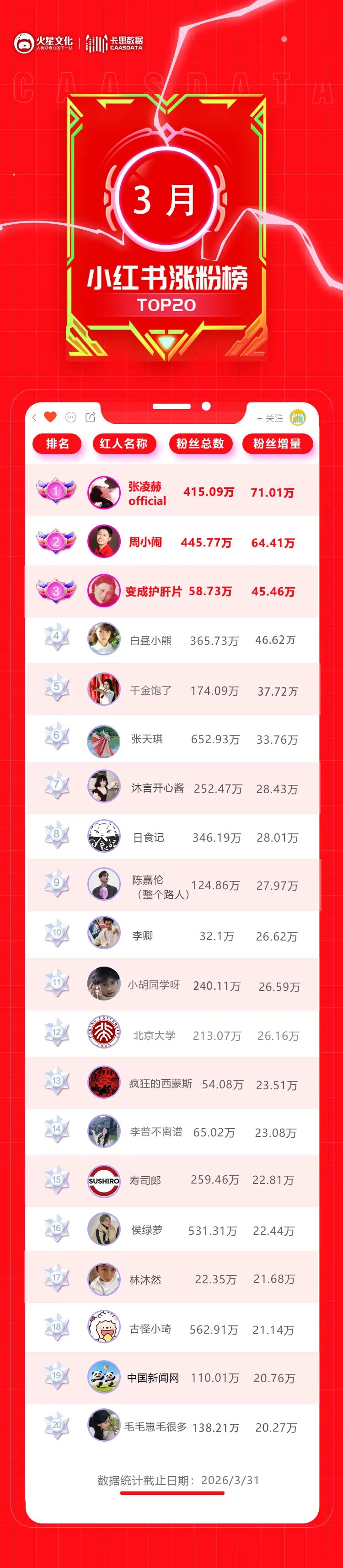 刚过去的3月,小红书内容生态有何新动态?让我们通过涨粉榜一探究竟: