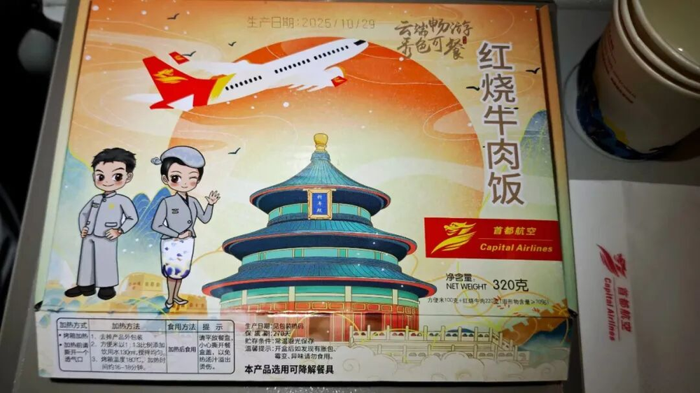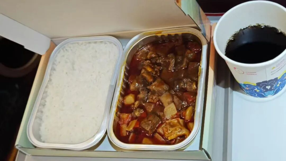 这份红烧牛肉饭,空乘说是为旅客“定制”的限量餐食,还强调“只剩最后几份了”。我当时还好奇飞机上怎么实现定制,结果付款后等了20分钟才拿到,期间一直说“在加热”,搞得挺神秘。