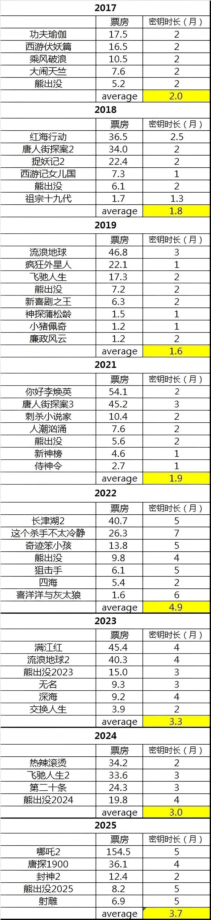 有网友统计2017—2025年历年春节档影片及票房2.5亿以上的非春节档影片(集中在五一档、暑期档)的延期情况,发现密钥延期是片方常规操作,尤其是有票房增长空间的影片,基本会通过延期实现收益最大化。