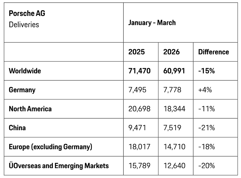 保时捷2026年一季度全球销量下滑15% 中国市场交付量同比降21%至7519辆