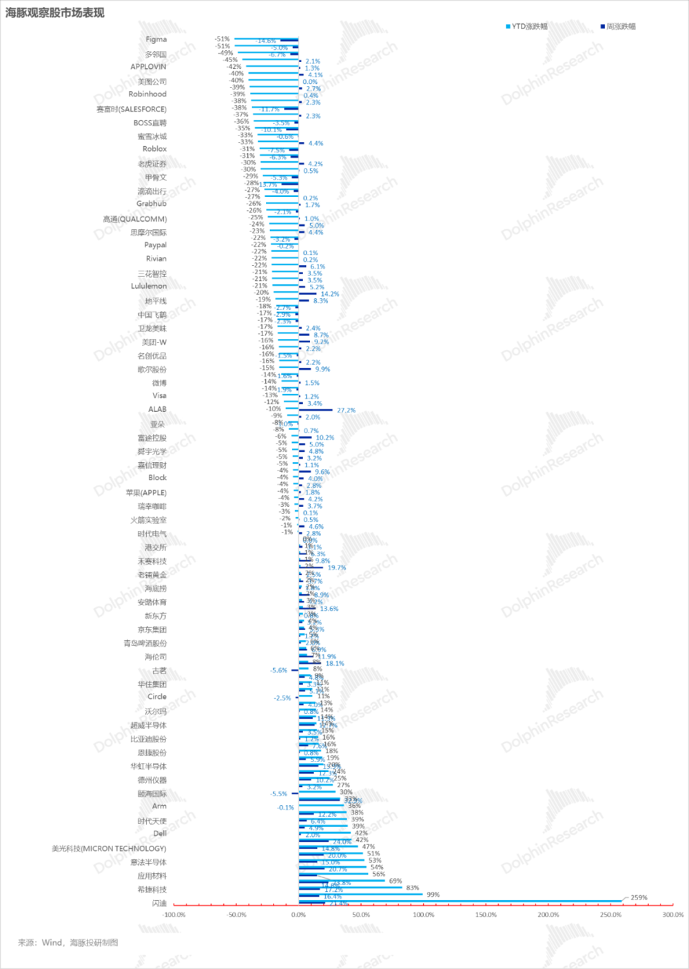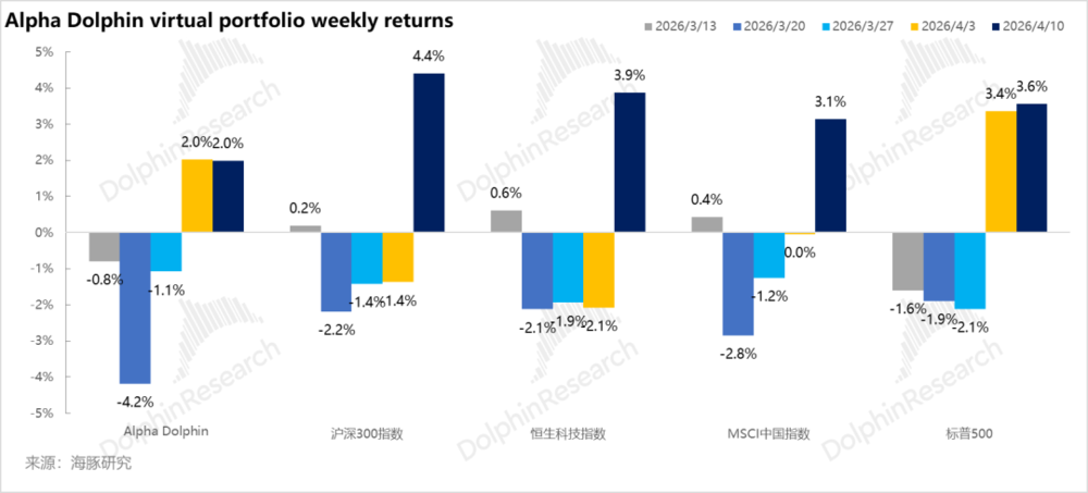 上周,海豚研究虚拟组合Alpha Dolphin未进行调仓。当周收益为2%,跑输沪深300(+4.4%)、MSCI中国指数(+3.1%)、恒生科技(+3.9%)以及标普500指数(+3.6%)。