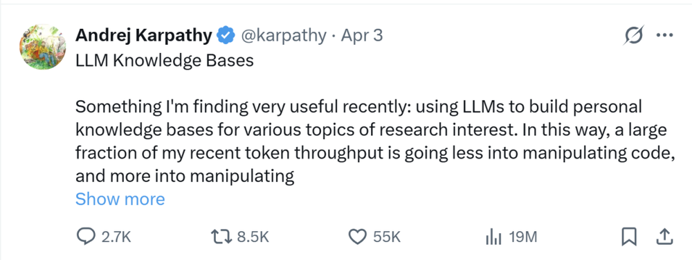 特斯拉前AI总监、OpenAI联合创始人Karpathy将这种情况称为“每次都在重新发现”。他在推特上发布了一篇关于LLM-Wiki的帖子,在AI圈和知识工作者圈迅速传播,目前已有1900多万人浏览过。