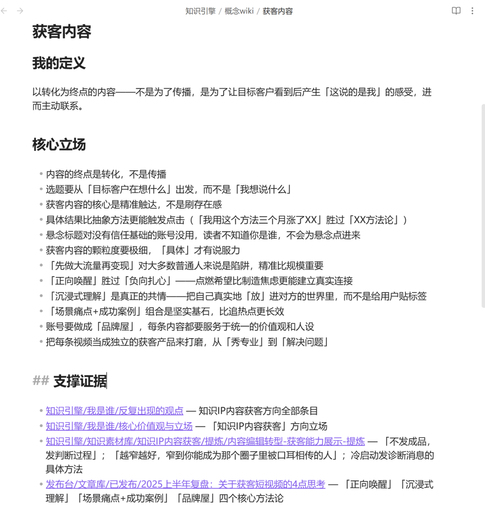 举个具体例子:一篇关于获客的文章进来,AI不会直接存档,而是把里面的观点拆解出来,合并到“获客内容”这个概念页中。已有的观点补充细节,与现有观点矛盾的单独标注,完全新的概念则另起一页。