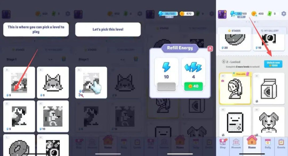 完成教学关后,玩家进入主线。主线关卡以至少6个为一组,需全部通关才能解锁下一组,否则需用硬币购买。