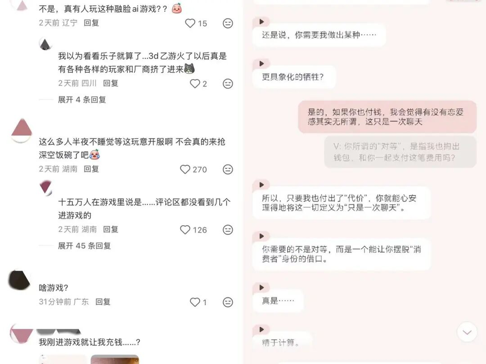 除了颜值问题,这款游戏主打的AI聊天也被玩家诟病“爹味十足”,有玩家花1400元和V聊哲学,讨论到对等话题时,V回复:“你需要的不是对等,而是摆脱‘消费者’身份的借口。真是……精于计算。”