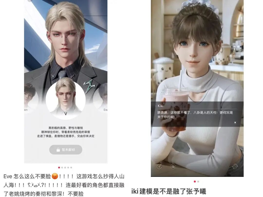 有网友表示男主之一V的建模像《恋与深空》的黎深和秦彻,甚至撞脸韩国男团成员李龙馥,主控闺蜜Kiki建模被指融合了女演员张予曦的脸。还有前求职者爆料首发男主Aven的脸模是“对着老板本人做的,用老板照片做基底图”。