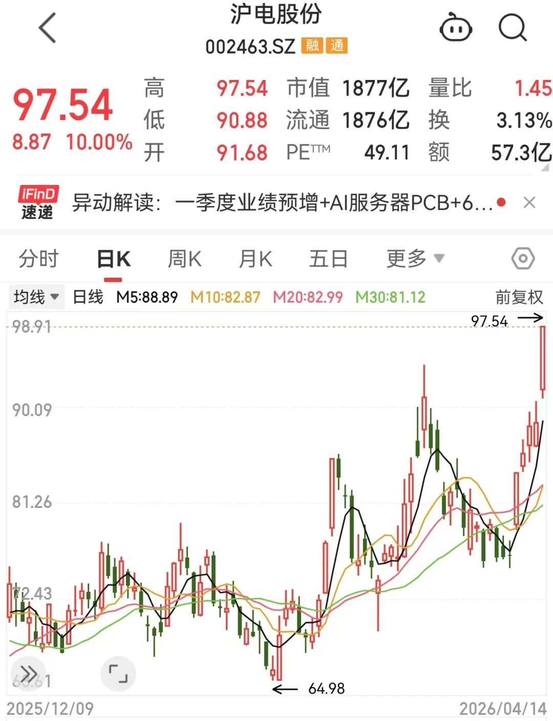4月14日早盘,PCB行业龙头沪电股份(002463)股价高开高走,开盘仅20分钟便封死涨停板,涨停封单一度超20万手,股价刷新历史最高纪录。该公司2025年净利润达38.22亿元,同比增长47.74%。