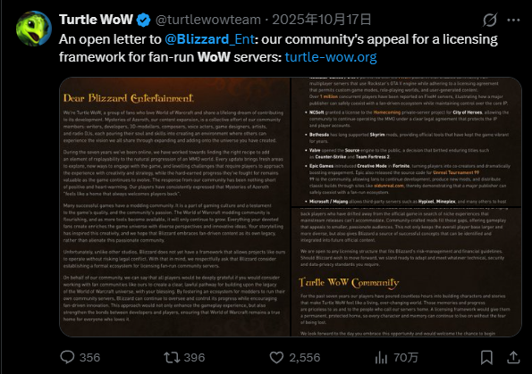过程中并非没有过挣扎,面对暴雪的强硬手段,乌龟服团队起初曾发布公开信,呼吁暴雪建立官方授权的私服许可框架,甚至表示愿意上缴利润分成以换取生存空间。
