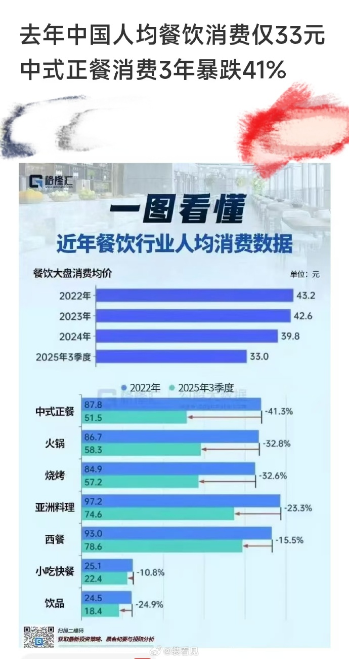 据统计,2025年三季度全国人均餐饮消费仅33元,中式正餐消费三年暴跌41%。看到这组数据时,我对消费下滑并不意外,但如此大的跌幅还是让我有些惊讶。