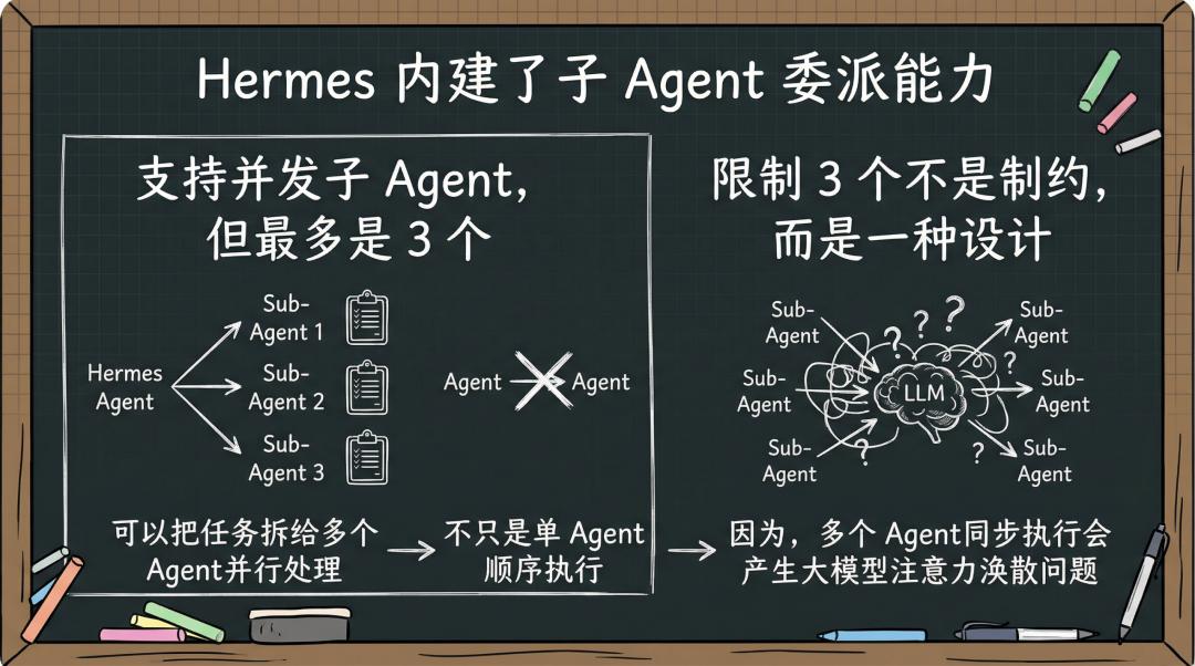 Hermes内置子Agent委派能力,支持并发子Agent,但最多3个。
