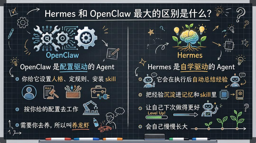 也就是说,OpenClaw更像庞大的技能库,Hermes更像边干活边学技能的系统。