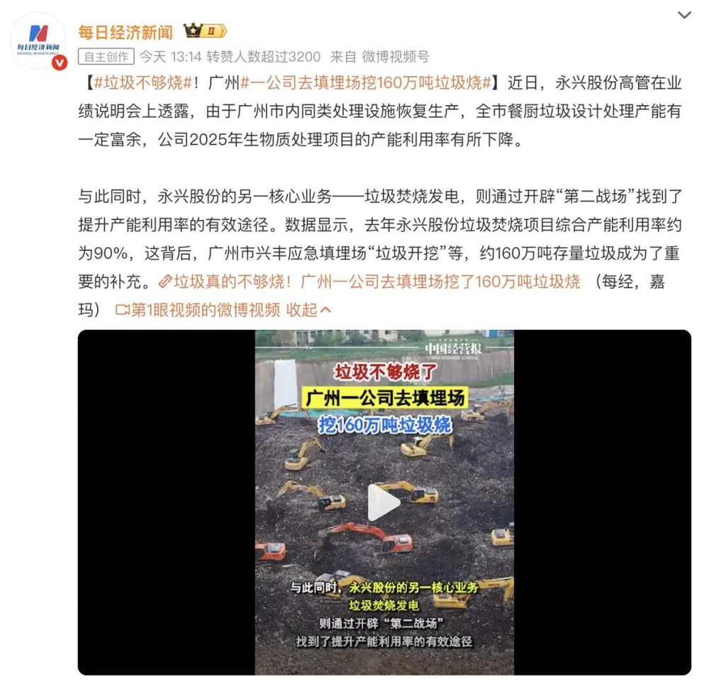 广州兴丰应急填埋场此前获批开挖存量垃圾,永兴股份披露,2025年一年就累计掺烧了约160万吨陈腐垃圾。
