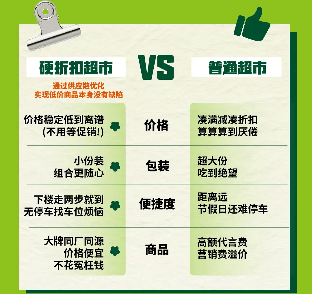 头部企业的实践印证了该模式的可行性。此前,物美聚焦大卖场的商品精简与供应链优化,完成门店效率升级后推出硬折扣品牌“物美超值”,以刚需商品满足大众消费需求;中百集团深耕社区超市,完成所有门店的商品结构与空间动线调整后,批量开设51家硬折扣门店,快速实现区域市场覆盖……