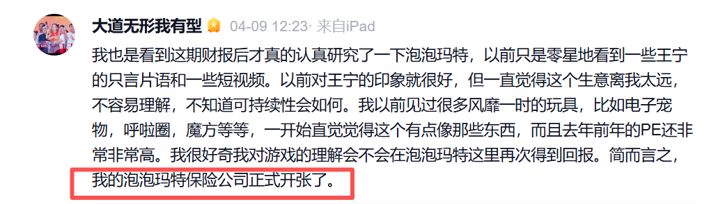 在此之前,段永平在4月9日公开表示:“我的泡泡玛特保险公司正式开始营业了。”
